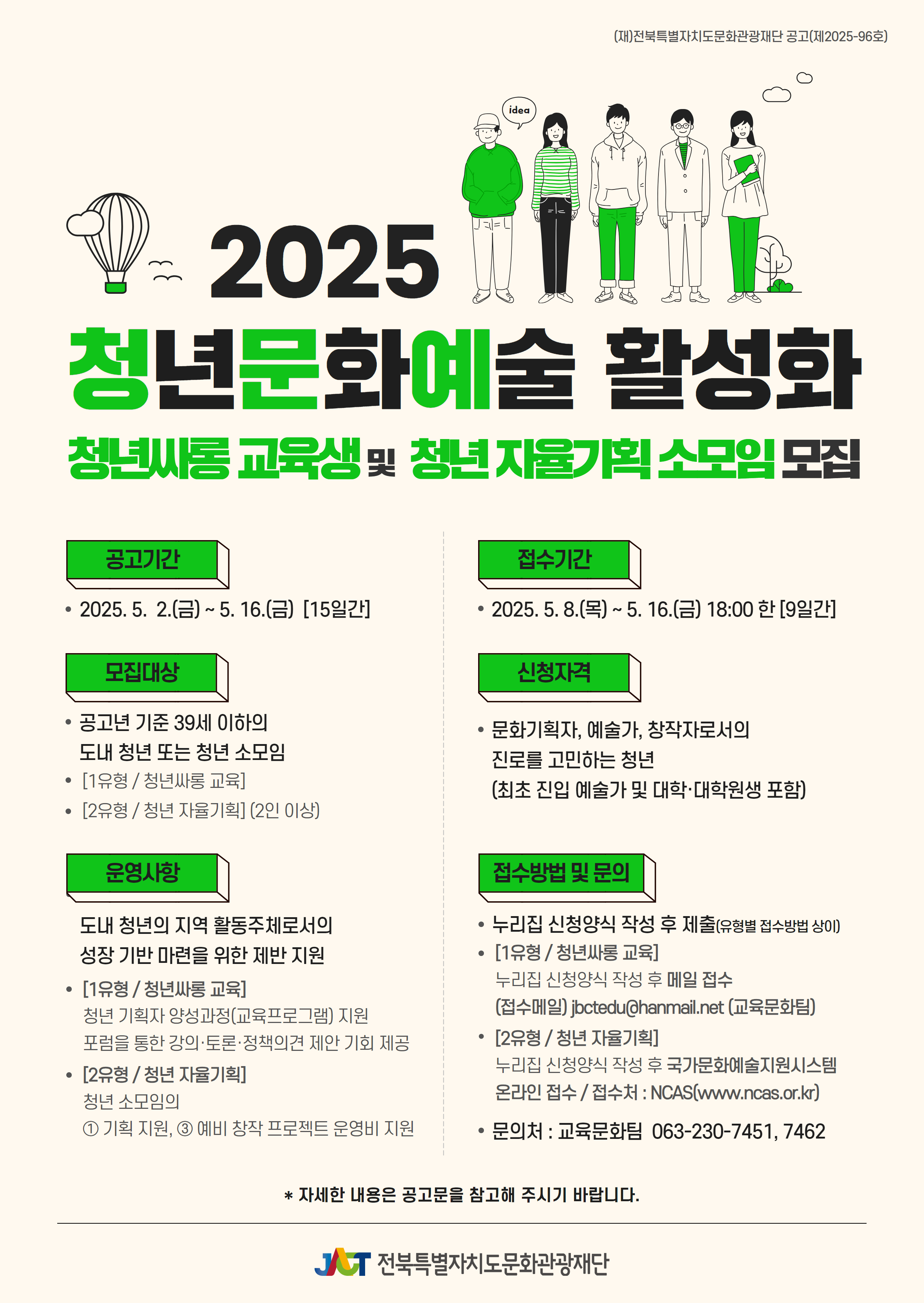 (전북특별자치도문화관광재단) 2025 청년문화예술 활성화 청년싸롱 교육생 및 청년 자율기획 소모임 공모 안내