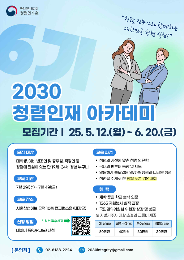 청렴연수원에서 2025년 2030 청렴인재 아카데미 교육생을 모집합니다. 관심있는 학생들은 많은 참여 바랍니다.