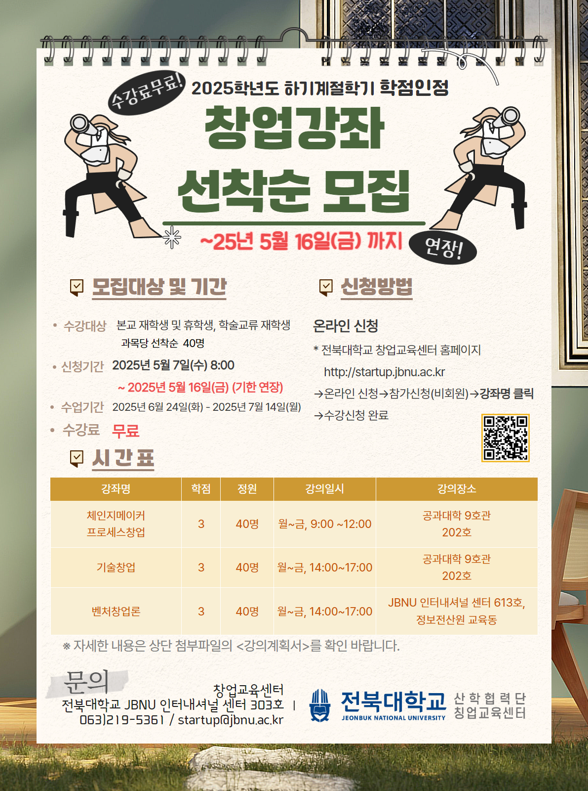[창업교육센터] 2025학년도 하기계절학기 창업강좌 수강생모집(5/7~5/16)(연장)