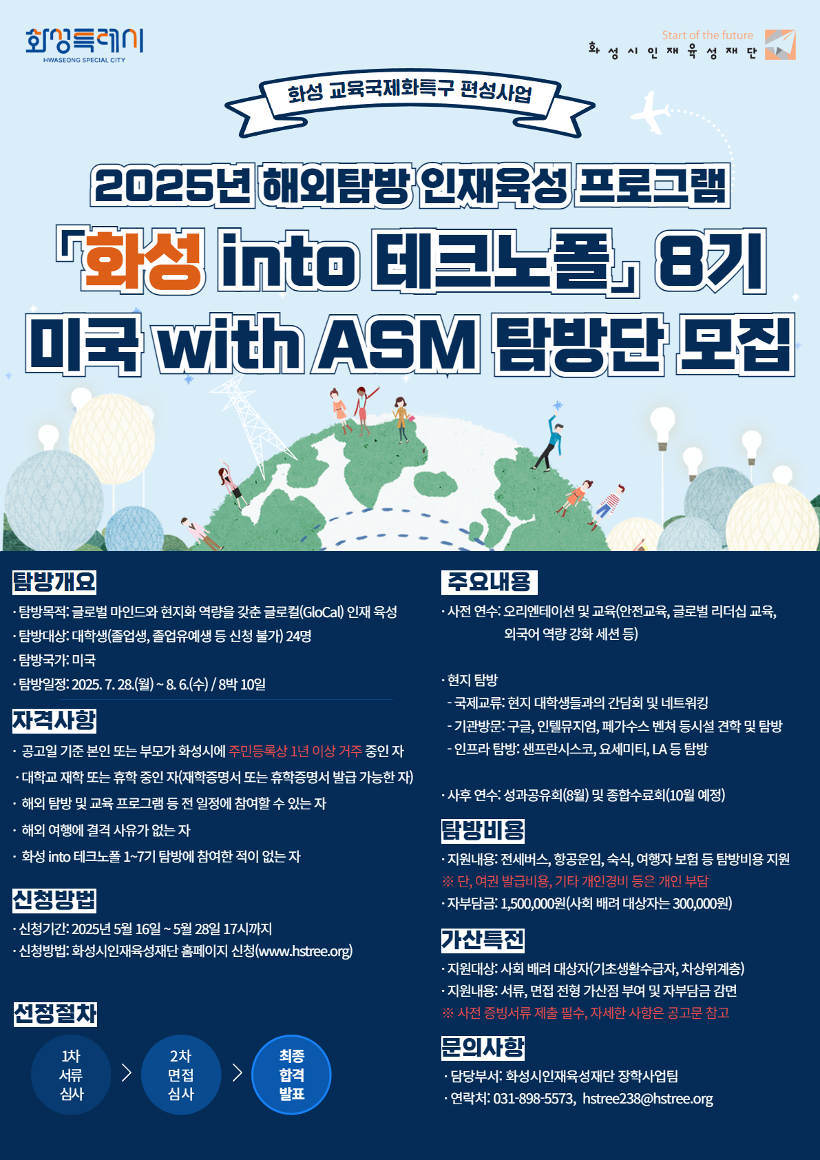 화성시인재육성재단에서 2025년 화성 into 테크노폴 8기 미국 탐방단을 모집합니다. 관심있는 학생들은 많은 참여 바랍니다.