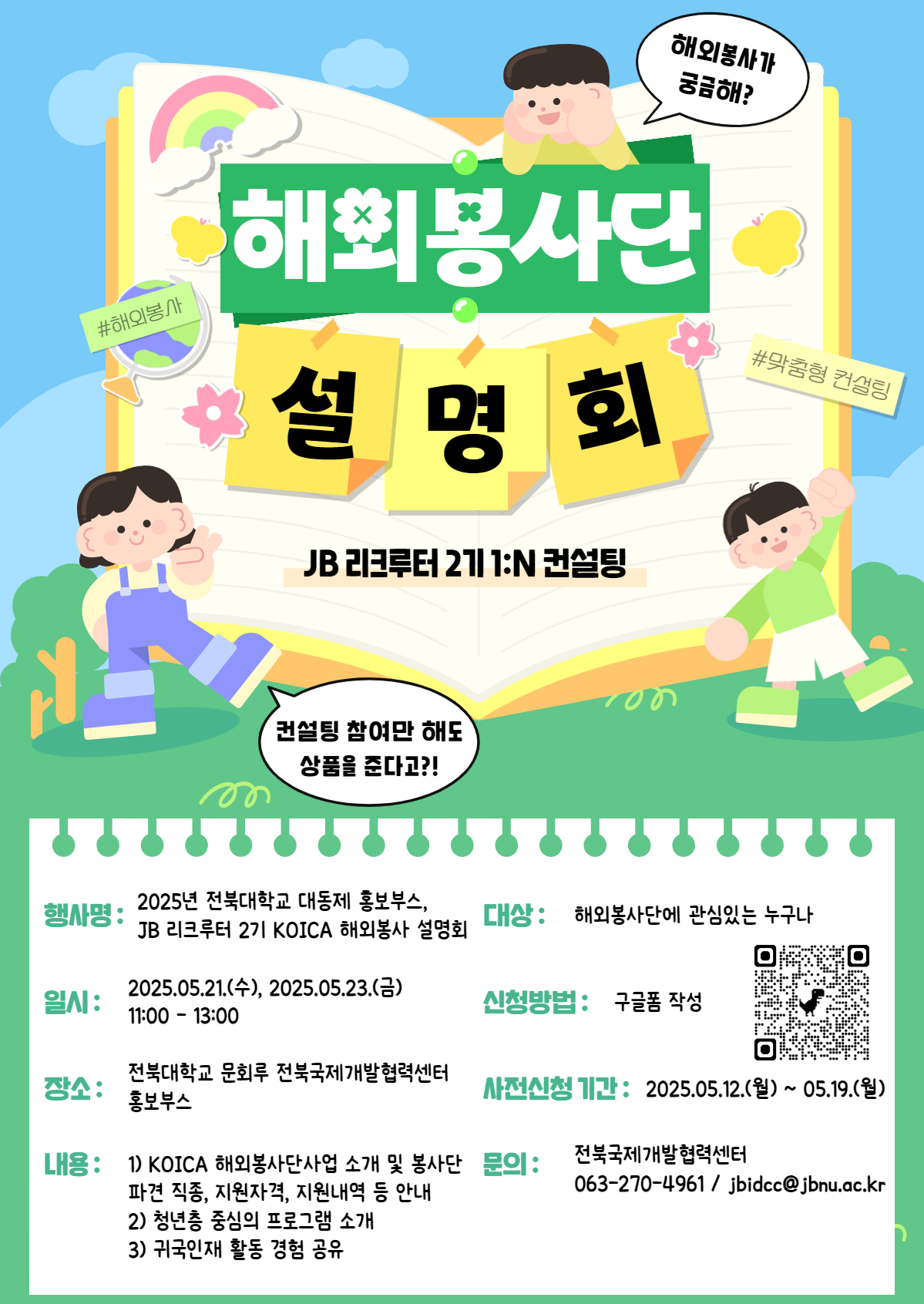 □ 행사명 : 2025년 전북대학교 대동제 홍보부스, JB 리크루터2기 KOICA 해외봉사 설명회