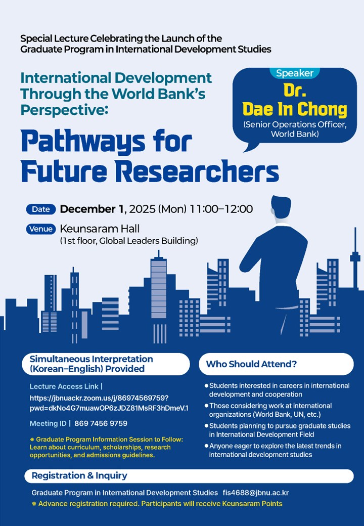 To commemorate the launch of the Graduate Program in International Development Studies at Jeonbuk National University, we are pleased to invite a World Bank expert to deliver a special lecture as outlined below.