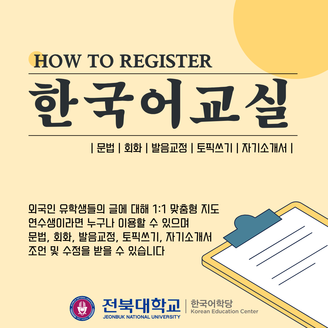홈페이지 신청 https://top.jbnu.ac.kr/lec_korean/index.do → 한국어 교실 신청 클릭 ( 대면지도 1 일 전 23:59 까지 선착순 신청 ) → 신청 확인 ( 홈페이지 ) → 대면지도 장소 (JBNU 인터내셔널센터 내 강의실 , 추후 메일로 통보 예정 ) 방문