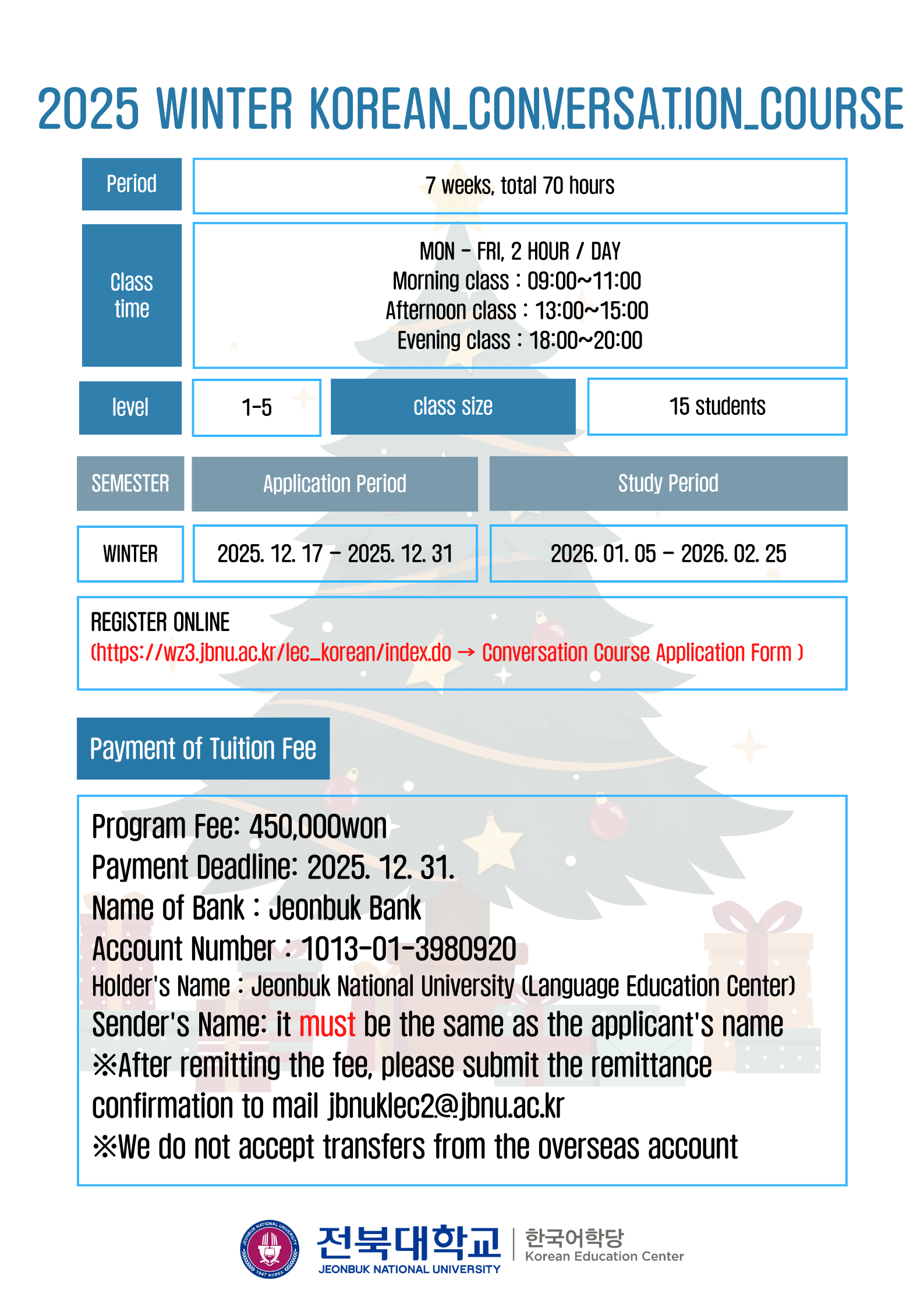 ※ After completing the payment, please send the receipt to our email: jbnuklec2@jbnu.ac.kr