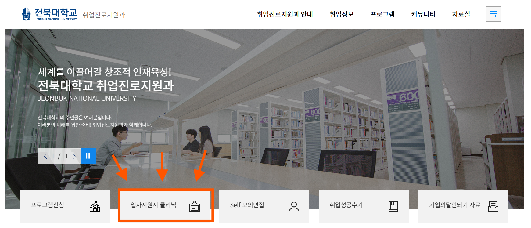○ 이용방법: 취업진로지원과 홈페이지(   https://career.jbnu.ac.kr/career/index.do)    [입사지원서 클리닉] 접속 ※ 하단 이미지 참고